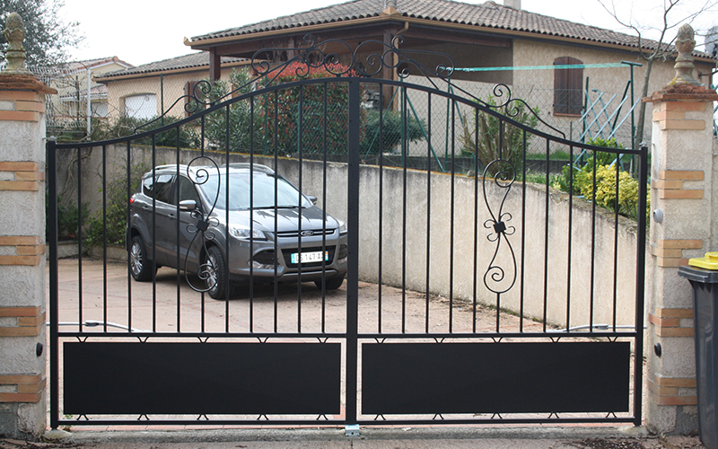 Portail fer 2 vantaux motorisé avec portillon assorti.